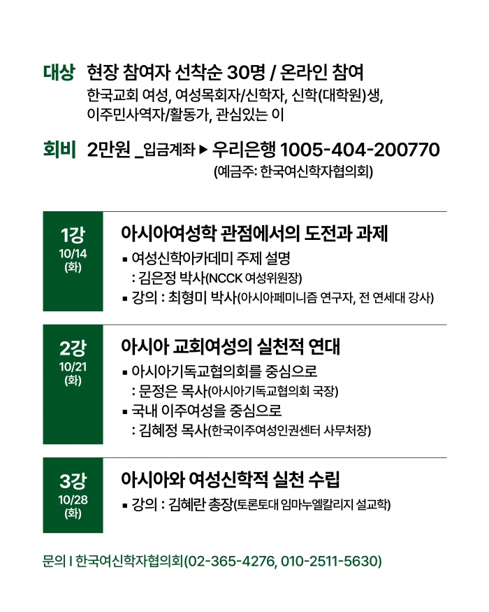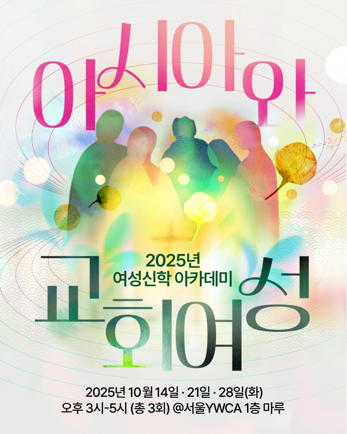 ◾주제: 아시아와 교회여성 ◾일시: 2025년 10월 14, 21, 28일(화) 오후 3시-5시 (총 3회) ◾장소: 서울YWCA 1층 마루(서울시 중구 명동 11길 20) / 온라인(줌) ◾공동주최: 서울YWCA 여성참여위원회, 한국교회여성연합회 교회개혁위원회, 한국기독교교회협의회 여성위원회, 한국여신학자협의회 교육위원회(가나다순) ◾방식: 현장(선착순 30명), 온라인(줌) ◾대상: 한국교회 기독여성, 여성목회자·신학자, 신학(대학원)생, 이주민사역자·활동가, 관심 있는 이 ◾신청링크: https://forms.gle/s81AqA5XWyoVjdM78 ◾회비: 2만원(회차 상관없이) ◾입금계좌: 우리은행 1005-404-200770 (예금주: 한국여신학자협의회)