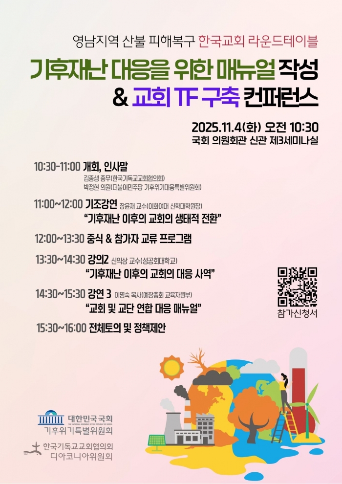 2. 한국기독교교회협의회(NCCK) 디아코니아위원회(송정경 위원장)는 국회 기후위기특별위원회 박정현 의원실과 함께 영남지역 산불피해 한국교회 라운드테이블 - 『기후재난 대응을 위한 매뉴얼 작성 및 교회 TF 구축 컨퍼런스』를 개최합니다. 일시는 2025년 11월 4일(화) 오전 10시 30분이며, 장소는 국회 의원회관 신관 제3세미나실입니다.