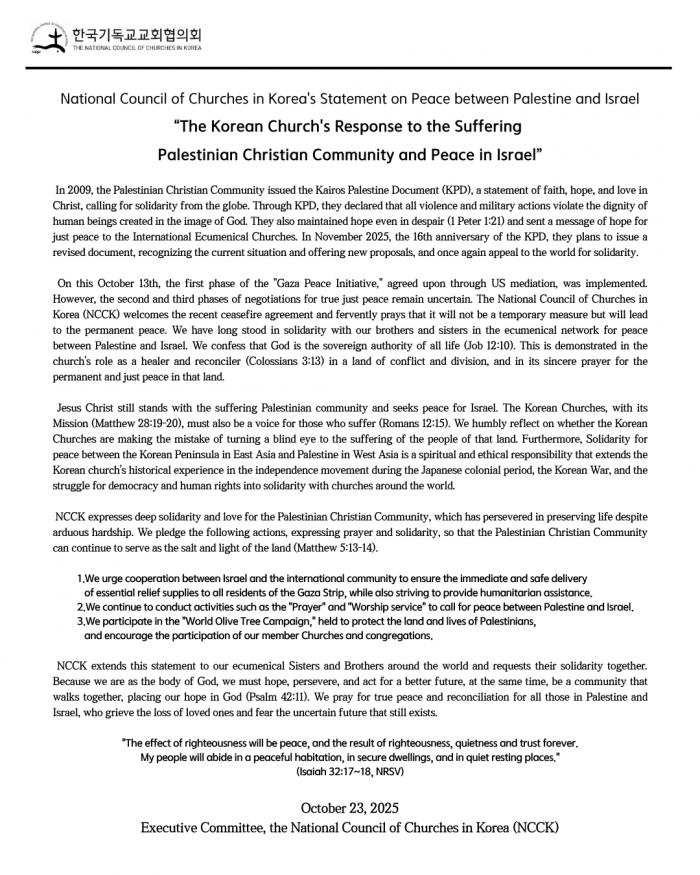 NCCK extends this statement to our ecumenical Sisters and Brothers around the world and requests their solidarity together. Because we are as the body of God, we must hope, persevere, and act for a better future, at the same time, be a community that walks together, placing our hope in God (Psalm 42:11). We pray for true peace and reconciliation for all those in Palestine and Israel, who grieve the loss of loved ones and fear the uncertain future that still exists. "The effect of righteousness will be peace, and the result of righteousness, (Isaiah 32:17~18, NRSV) October 23, 2025 Executive Committee, the National Council of Churches in Korea (NCCK)