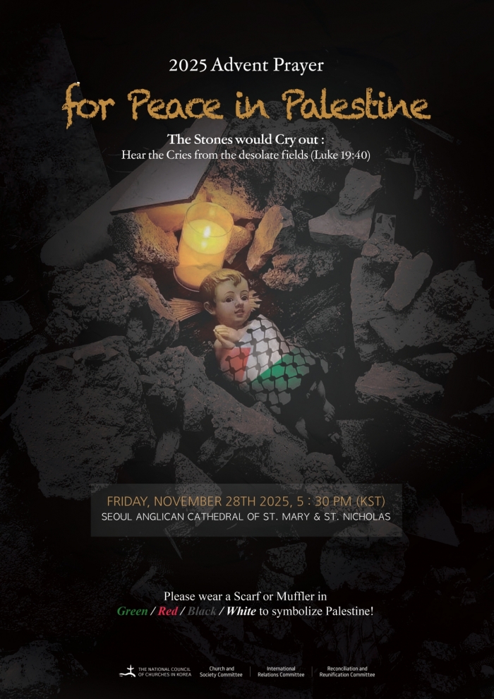 한국기독교교회협의회(이하 NCCK)는 아기 예수를 기다리는 이 시간, 하늘의 정의와 평화가 고통당하는 이들의 삶 가운데 임하기를 기도하며, 다음과 같이 팔레스타인 평화를 위한 대림절 기도의 자리를 마련하고자 합니다.