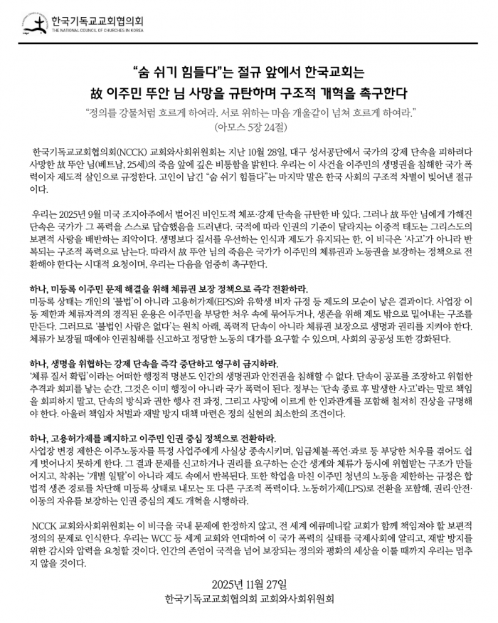 2. 한국기독교교회협의회(NCCK, 총무 박승렬 목사) 교회와사회위원회(위원장 이재호 목사)는 <“숨 쉬기 힘들다”는 절규 앞에서, 故 이주민 뚜안 님 사망을 규탄하며 구조적 개혁을 촉구한다.>라는 제목의 입장문을 아래와 같이 발표합니다.