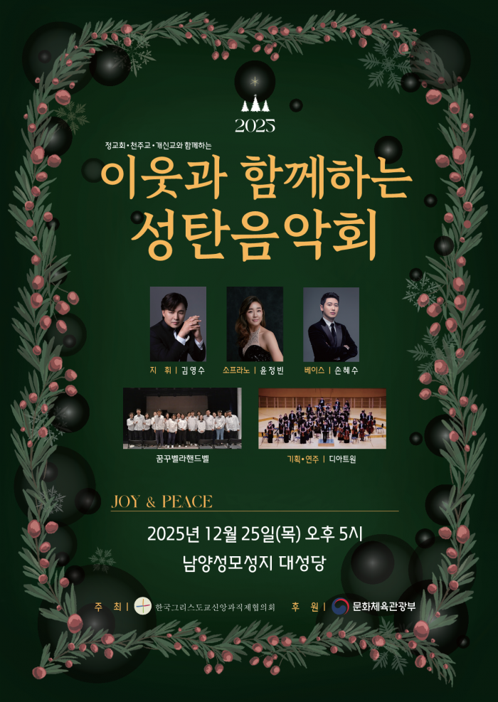 2. 한국 그리스도교 신앙과 직제협의회(공동의장 이용훈 주교·박승렬 총무, 이하 한국신앙과직제)는 한국 그리스도인의 일치와 신앙적 친교를 바탕으로 공동체적 연대를 확장하고자 다양한 협력 사역을 전개해 왔습니다. 한국신앙과직제는 오는 2025년 12월 25일(목) 오후 5시, 남양성모성지 대성당에서 「2025 이웃과 함께하는 성탄음악회」를 개최합니다.