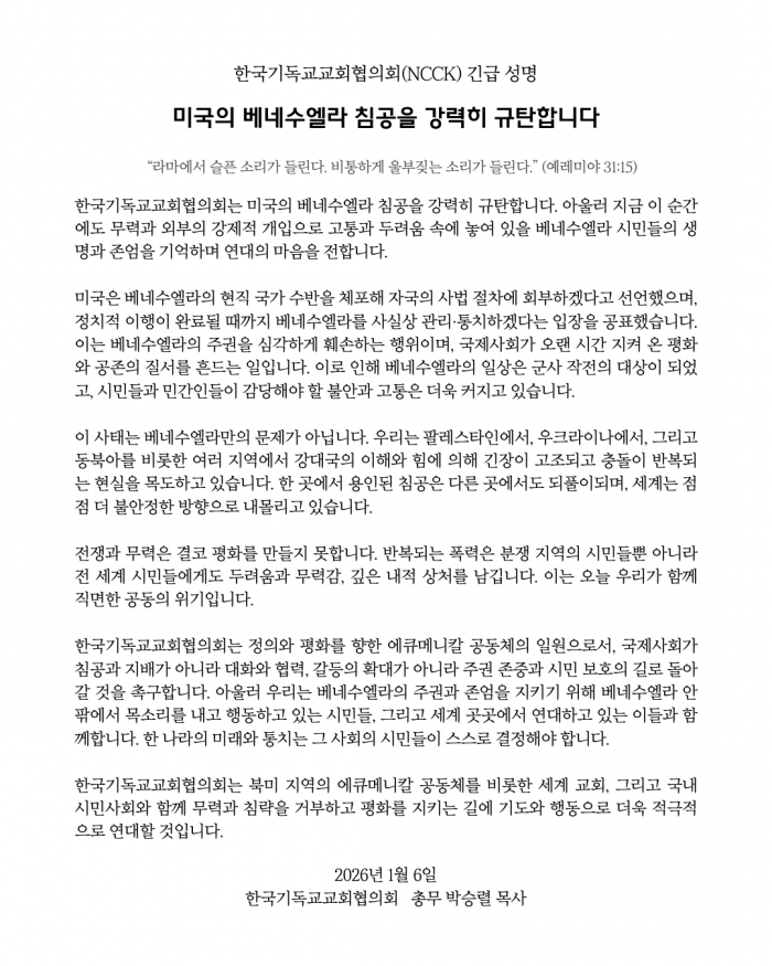 교회협 언론 2025 - 01호 (2026. 01. 06.) 수 신: 각 언론사 발 신: 한국기독교교회협의회(NCCK) 제 목: 미국의 베네수엘라 침공 규탄 성명 보도 요청의 건 |