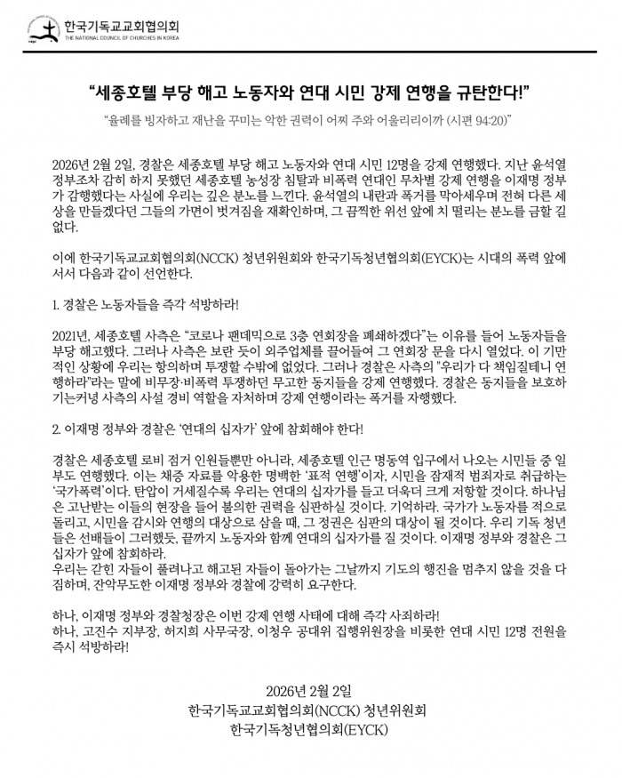 한국기독교교회협의회(NCCK, 박승렬 총무) 청년위원회(조은아 위원장)와 한국기독청년협의회(EYCK, 김진수 총무)는 공동으로 어제(2월 2일) 세종호텔에서 자행된 폭력적 강제 연행을 규탄하며 아래의 입장을 발표했습니다.