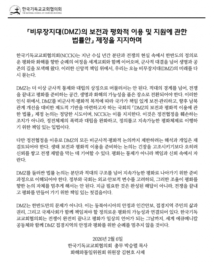 2. 한국기독교교회협의회(NCCK, 박승렬 총무) 화해와통일위원회(김현호 위원장)는 「비무장지대(DMZ)의 보전과 평화적 이용 및 지원에 관한 법률안」 제정을 지지하며, 한반도의 정의롭고 지속가능한 평화를 촉구하는 논평을 발표했습니다.