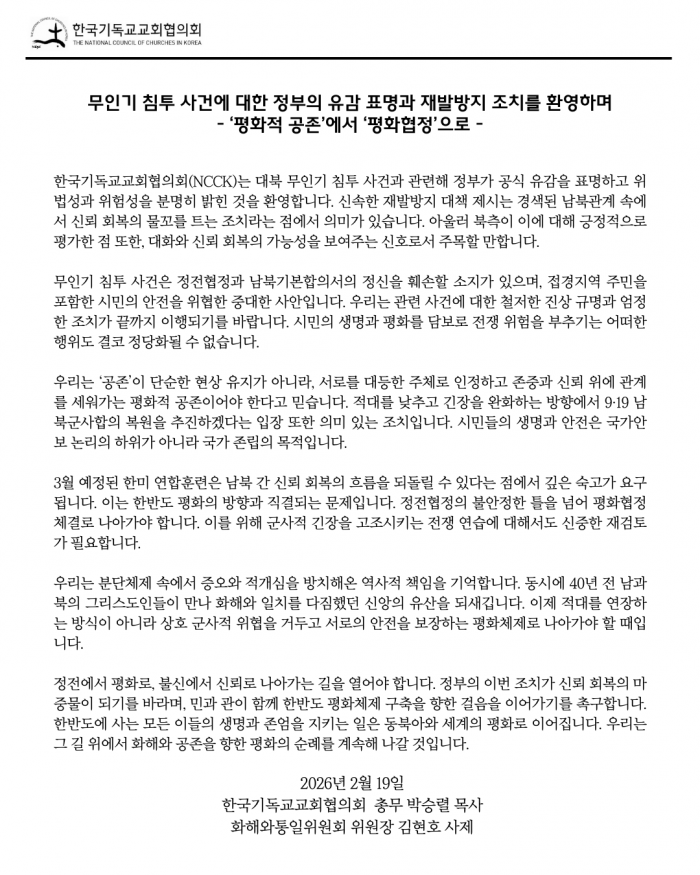 한국기독교교회협의회(NCCK)는 대북 무인기 침투 사건과 관련해 정부가 공식 유감을 표명하고 위법성과 위험성을 분명히 밝힌 것을 환영합니다. 신속한 재발방지 대책 제시는 경색된 남북관계 속에서 신뢰 회복의 물꼬를 트는 조치라는 점에서 의미가 있습니다. 아울러 북측이 이에 대해 긍정적으로 평가한 점 또한, 대화와 신뢰 회복의 가능성을 보여주는 신호로서 주목할 만합니다.
