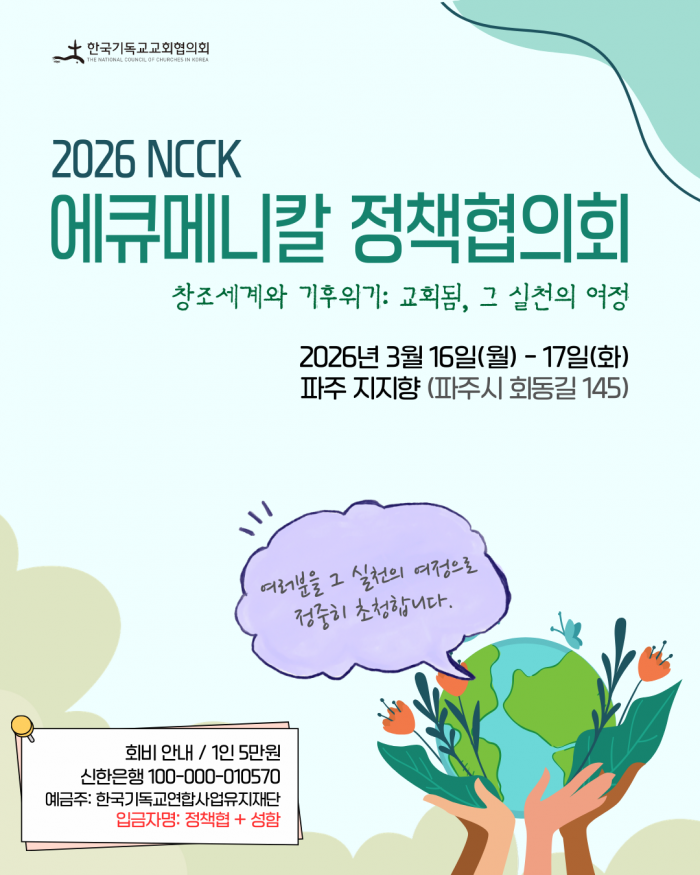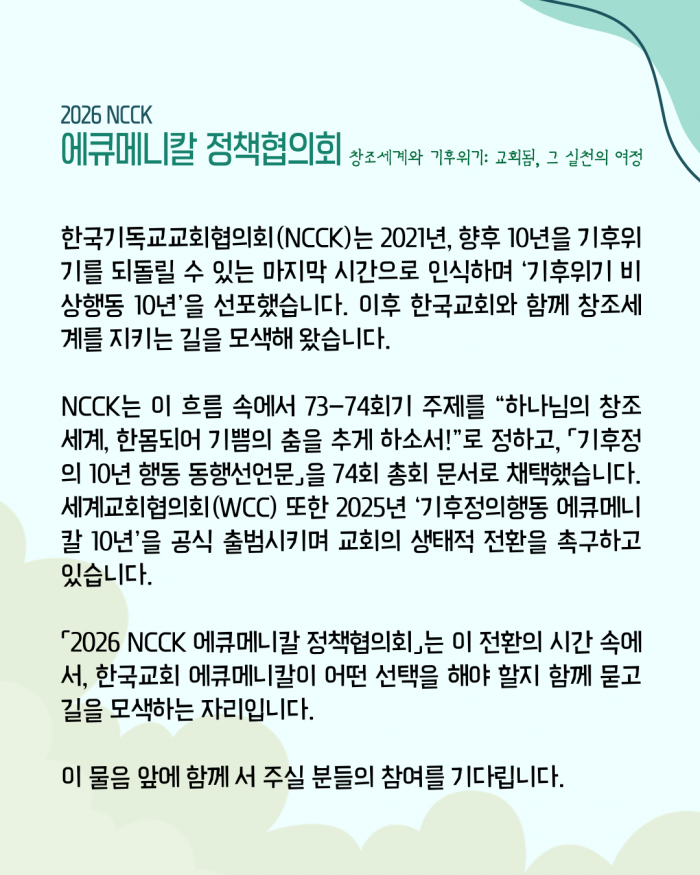 2. 한국기독교교회협의회(NCCK, 회장 정훈 목사, 총무 박승렬 목사)는 「창조세계와 기후위기: 교회됨, 그 실천의 여정」을 주제로 2026 NCCK 에큐메니칼 정책협의회를 개최합니다.