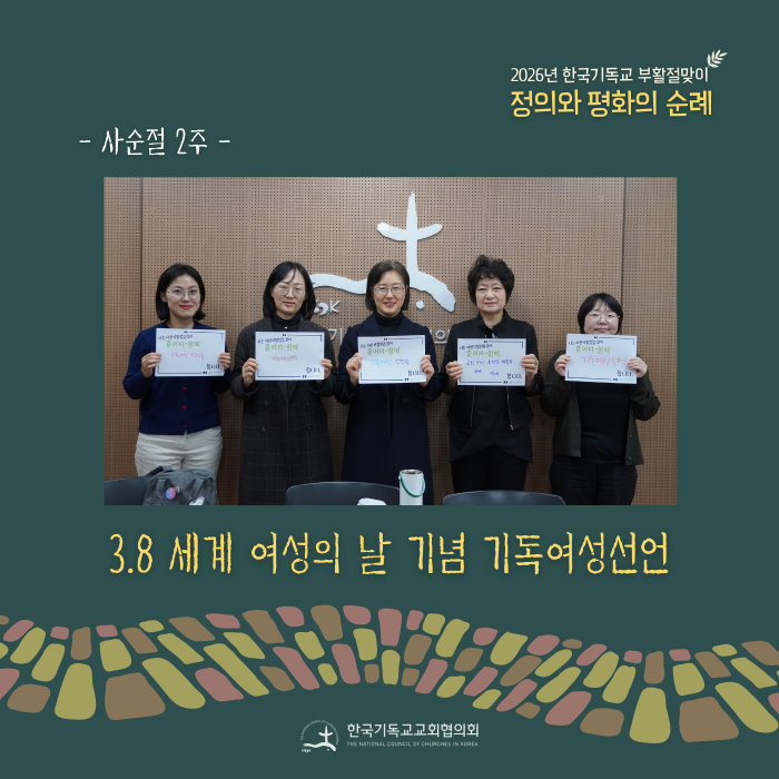 특별히 교회협 여성위원회(위원장 김은정 목사)는 ‘2026년 한국기독교 부활절 맞이’ 활동으로 3월 5일(목) 오후 3시, 한국기독교회관 701호에서 올해 3.8 세계여성의날의 메시지 “Give to Gain”(나눔으로 커진다) 앞에서 성평등에 관한 책임을 깊이 성찰하며, 구체적 실천을 다짐하는 기독여성선언을 발표했습니다.
