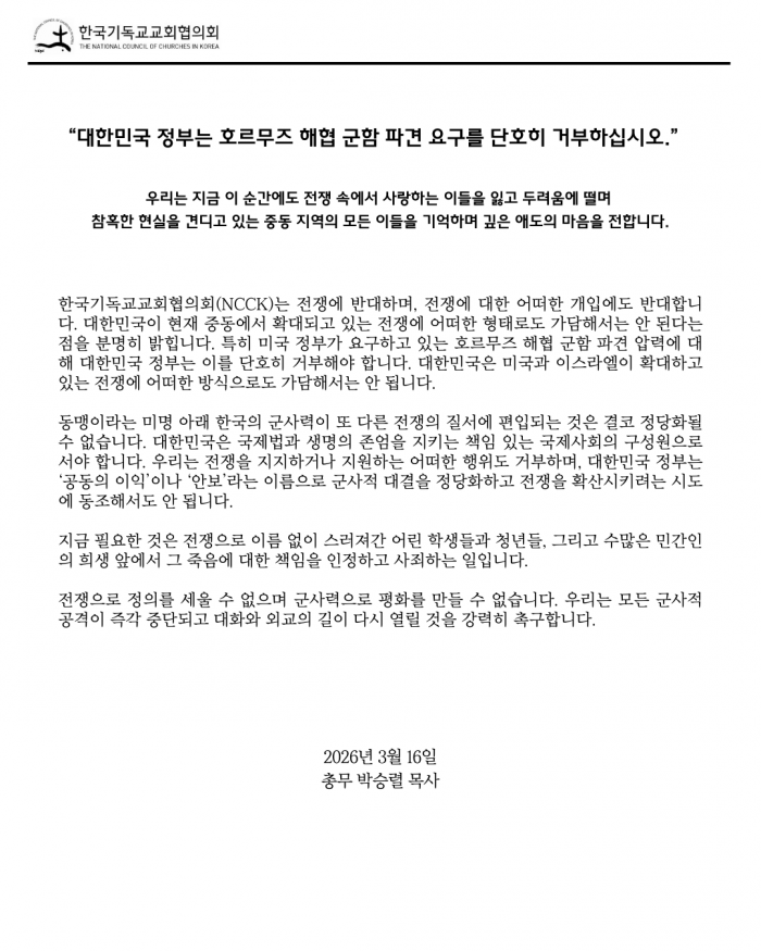 1. 한국기독교교회협의회(NCCK, 총무 박승렬)는 최근 중동 지역에서 확대되고 있는 전쟁 상황에 깊은 우려를 표하며, 대한민국이 어떠한 형태로도 전쟁에 가담해서는 안 된다는 입장을 밝힙니다. 특히 미국 정부가 요구하고 있는 호르무즈 해협 군함 파견 압력에 대해 대한민국 정부는 이를 단호히 거부할 것을 촉구합니다. 2. NCCK는 전쟁과 그에 대한 어떠한 군사적 개입에도 반대합니다. 우리는 긴급 성명을 통해 대한민국은 미국과 이스라엘이 확대하고 있는 전쟁에 가담해서는 안 되며, 동맹이라는 이름으로 한국의 군사력이 또 다른 전쟁의 질서에 편입되는 것은 결코 정당화될 수 없음을 밝혔습니다. 대한민국은 전쟁의 연합이 아니라 국제법과 생명의 존엄을 지키는 책임 있는 국제사회의 구성원으로 서야 합니다.