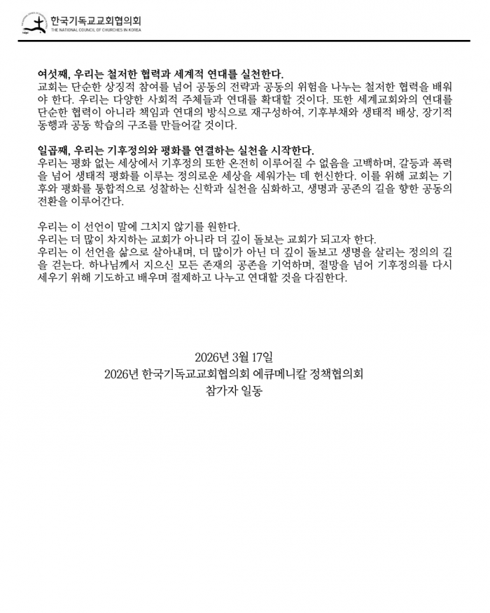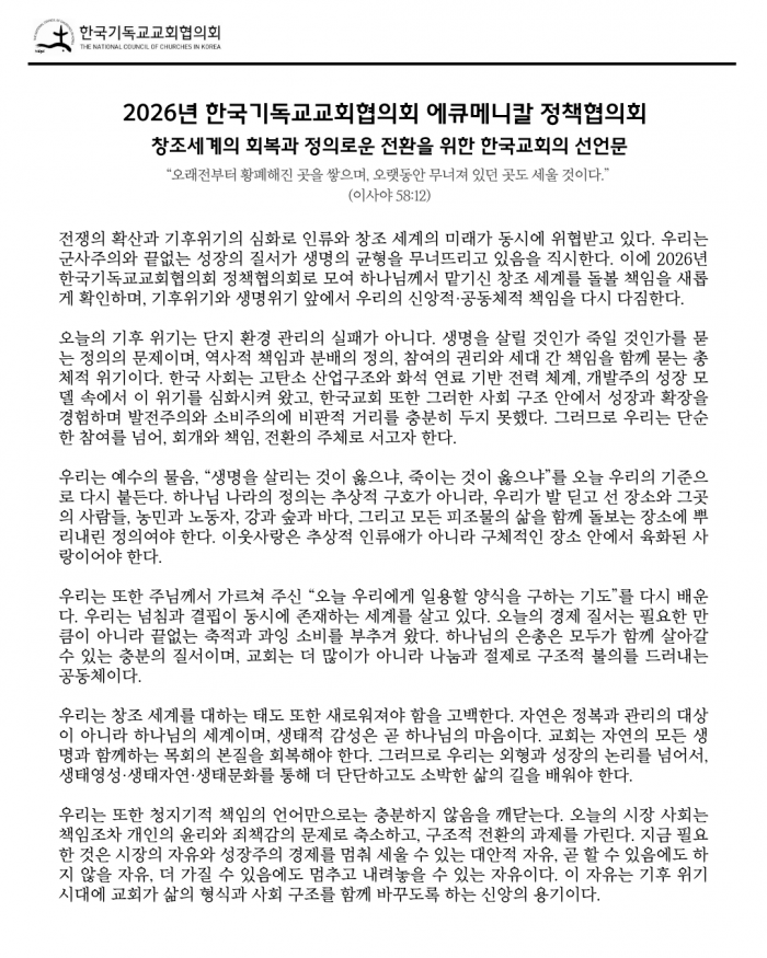 전쟁의 확산과 기후위기의 심화로 인류와 창조 세계의 미래가 동시에 위협받고 있다. 우리는 군사주의와 끝없는 성장의 질서가 생명의 균형을 무너뜨리고 있음을 직시한다. 이에 2026년 한국기독교교회협의회 정책협의회로 모여 하나님께서 맡기신 창조 세계를 돌볼 책임을 새롭게 확인하며, 기후위기와 생명위기 앞에서 우리의 신앙적·공동체적 책임을 다시 다짐한다.