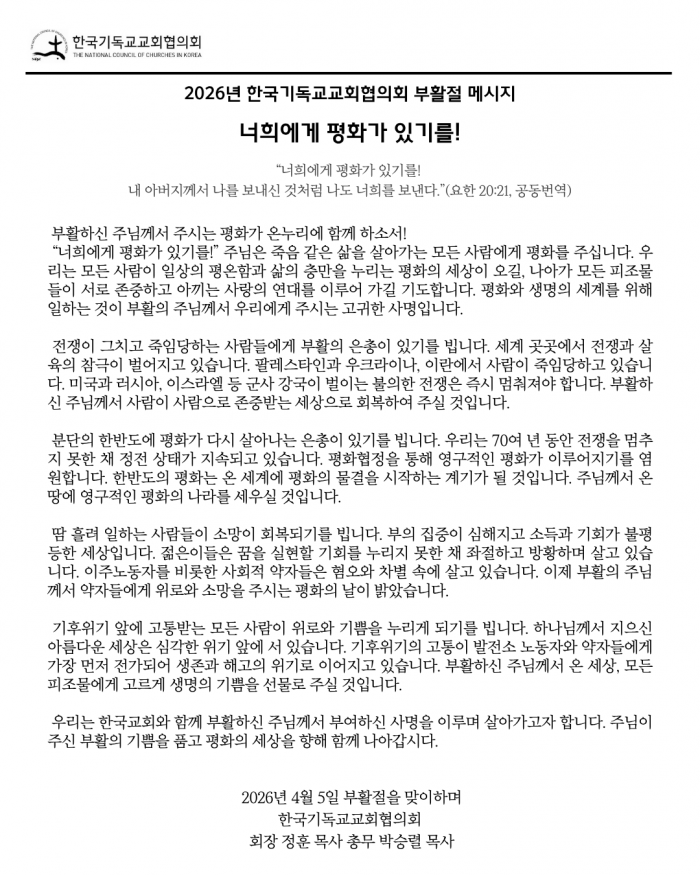 1. 한국기독교교회협의회(NCCK, 총무 박승렬 목사, 이하 교회협)는 2026년 부활절을 맞이하며 “너희에게 평화가 있기를!”(요 20:21)라는 제목의 부활절 메시지를 발표합니다.