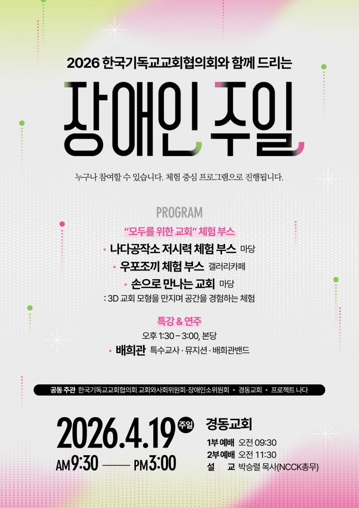 2026년 장애인주일 기념예배는 NCCK 교회와사회위원회(위원장 이재호 목사) 장애인소위원회와 경동교회가 공동으로 주관합니다. 이번 예배에서 박승렬 총무는 “함께 알아보는 부활, 함께 살아내는 공동체”를 주제로 설교할 예정입니다. 예배 이후에는 장애인의 삶과 권리에 대한 이해를 넓히기 위한 장애인 인식개선 체험 부스도 운영됩니다.