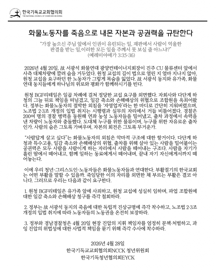 한국기독교교회협의회(NCCK, 박승렬 총무) 청년위원회(조은아 위원장)와 한국기독청년협의회(EYCK, 김소혜 회장)는 2026년 4월 20일 진주 CU 물류센터에서 발생한 화물연대 조합원 사망사건과 관련한 입장을 담아 성명서를 발표합니다.